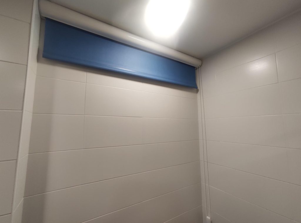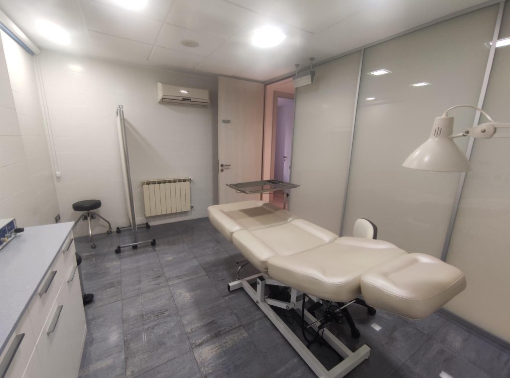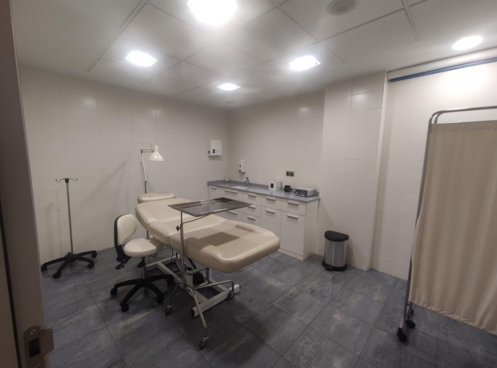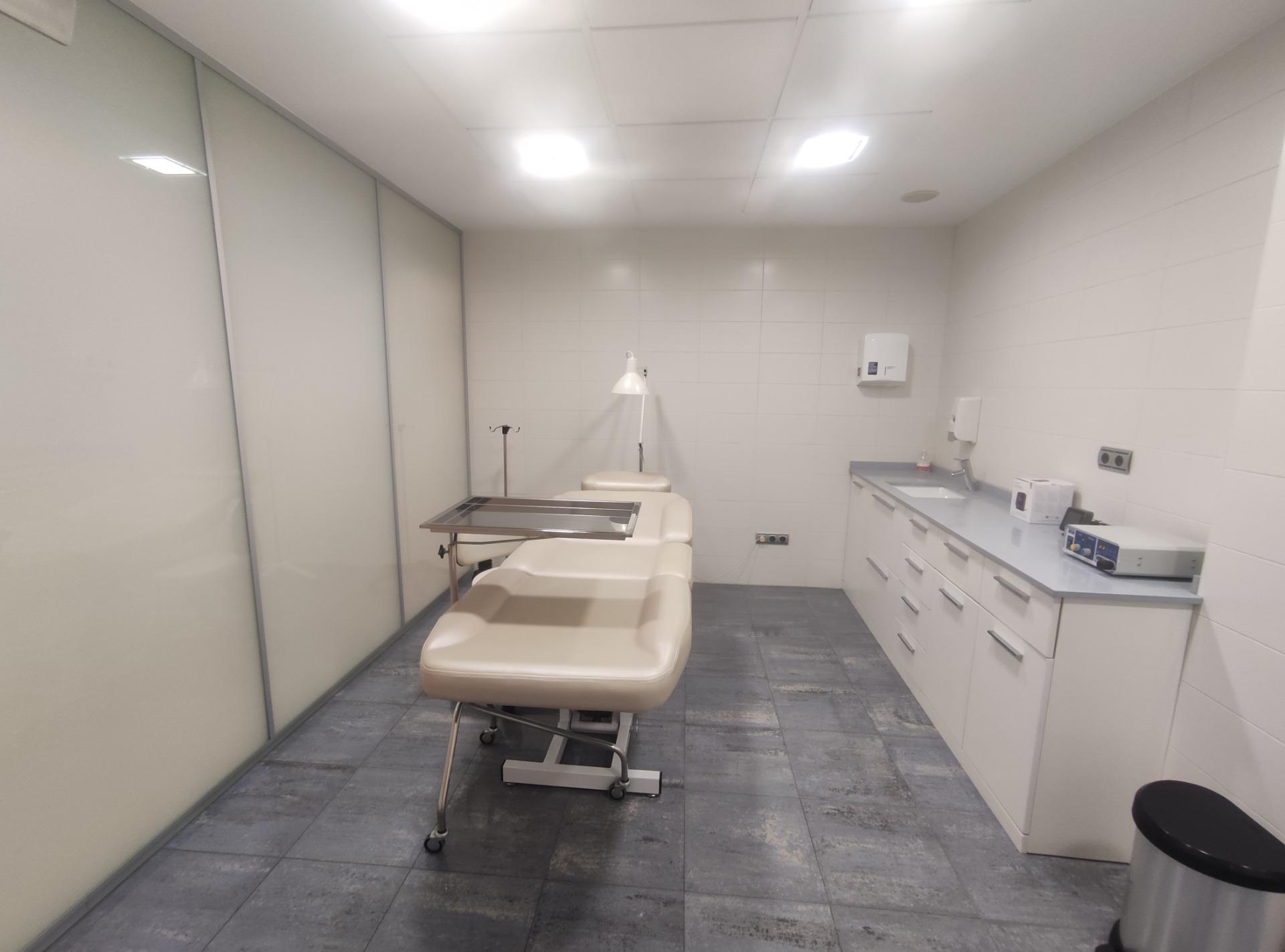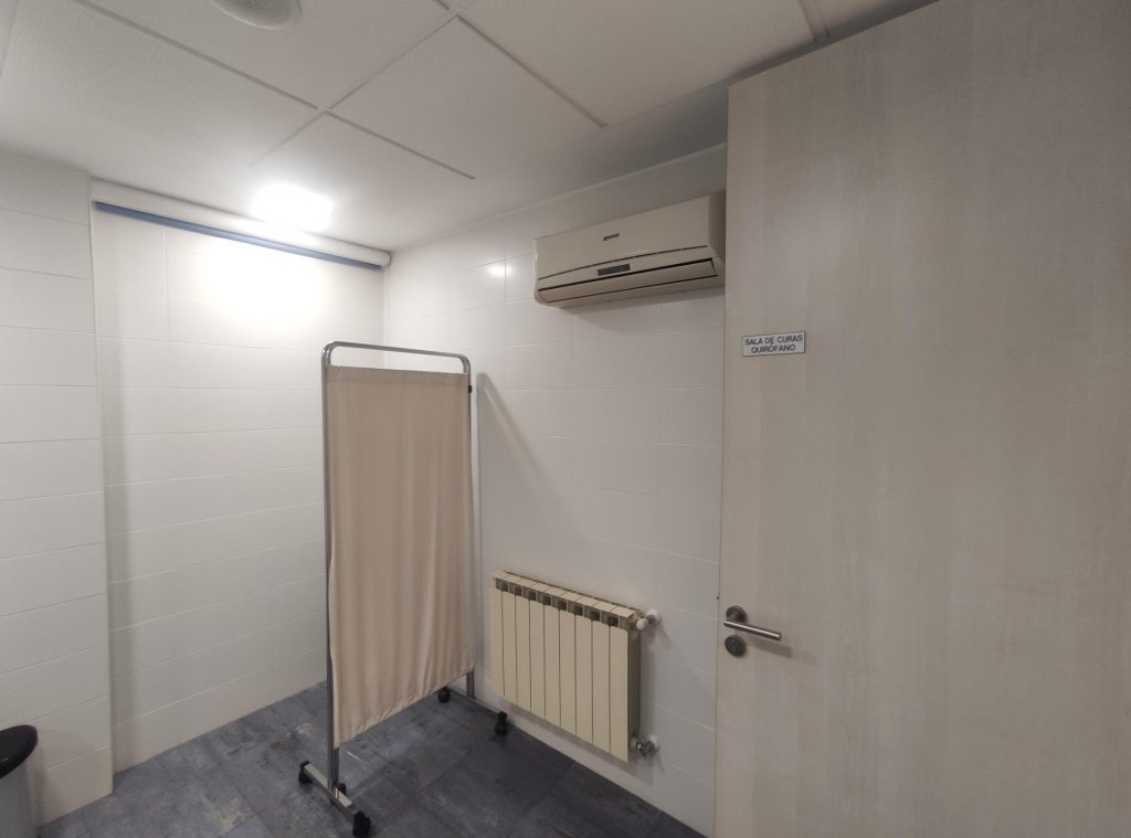 Sala de curas o pequeño quirófano con encimera y lavamanos.