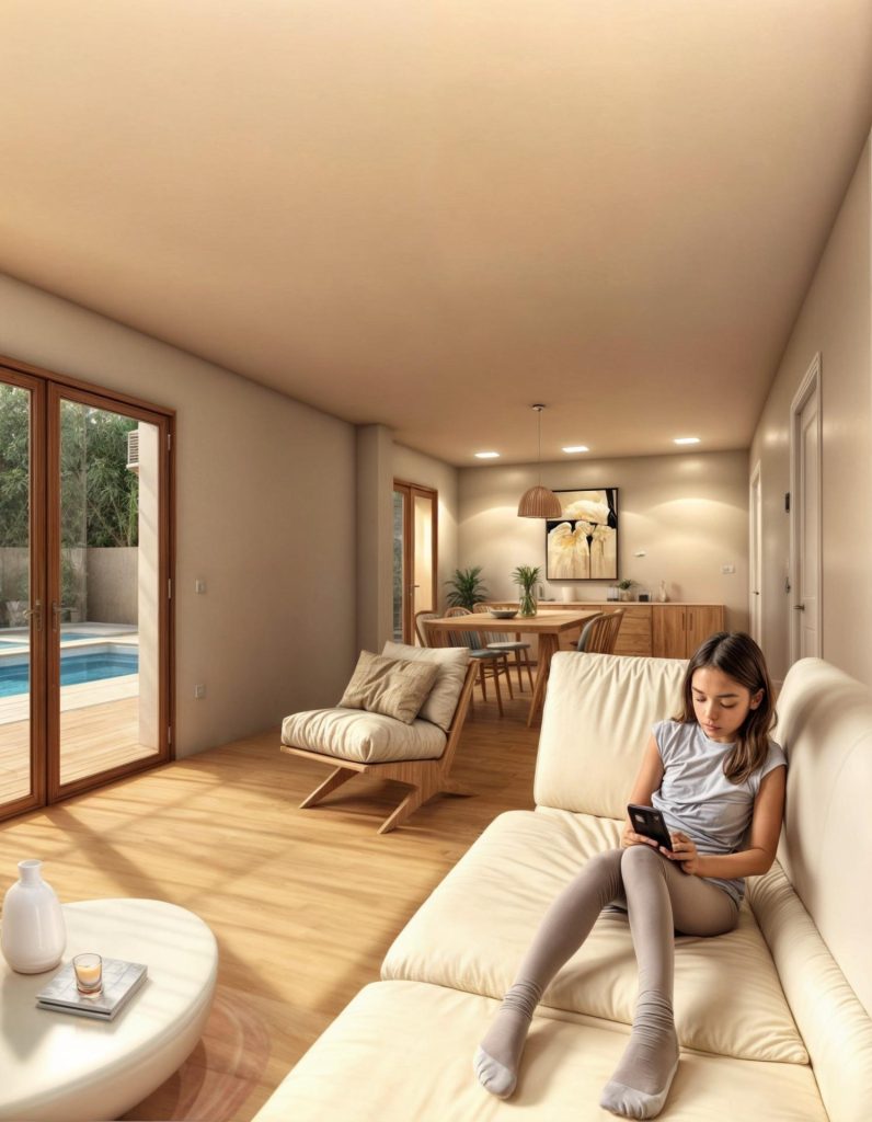 Durante la ejecución podrás elegir entre distintas opciones de cerámicas, cocina, baños, iluminación, energía solar, piscina y mobiliario, adaptando la vivienda a tus necesidades.