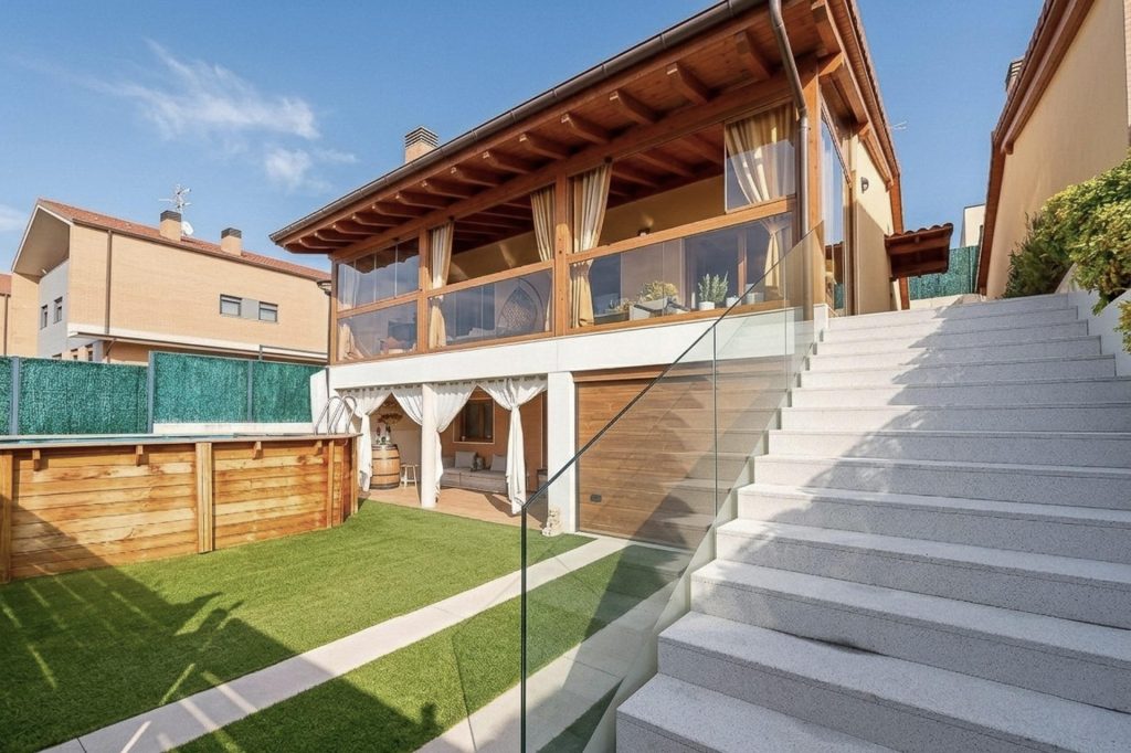 La propiedad se asienta sobre una parcela de 336 m² y está rodeada por jardín delantero y trasero, con sistema de riego automático en todas las zonas verdes, lo que facilita su mantenimiento y permite disfrutar del exterior durante todo el año.
